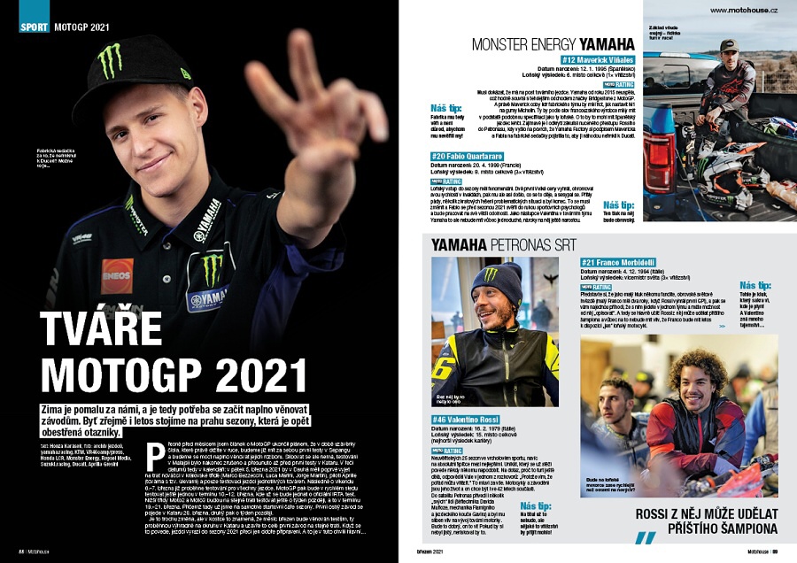 Zima je pomalu za námi, a je tedy potřeba se začít naplno věnovat závodům. Byť zřejmě i letos stojíme na prahu sezony, která je opět obestřená otazníky. Slibovat se ale nemá, testování v Malajsii bylo nakonec zrušeno a přesunuto až před první testy v Kataru. V řeči datumů tedy v kalendáři: v pátek 5. března 2021 by v Dauhá měli poprvé vyjet na trať nováčci v královské třídě (Marco Bezzecchi, Luca Marini, Jorge Martín), piloti Aprilie (továrna s tzv. úlevami) a pouze testovací jezdci jednotlivých továren.