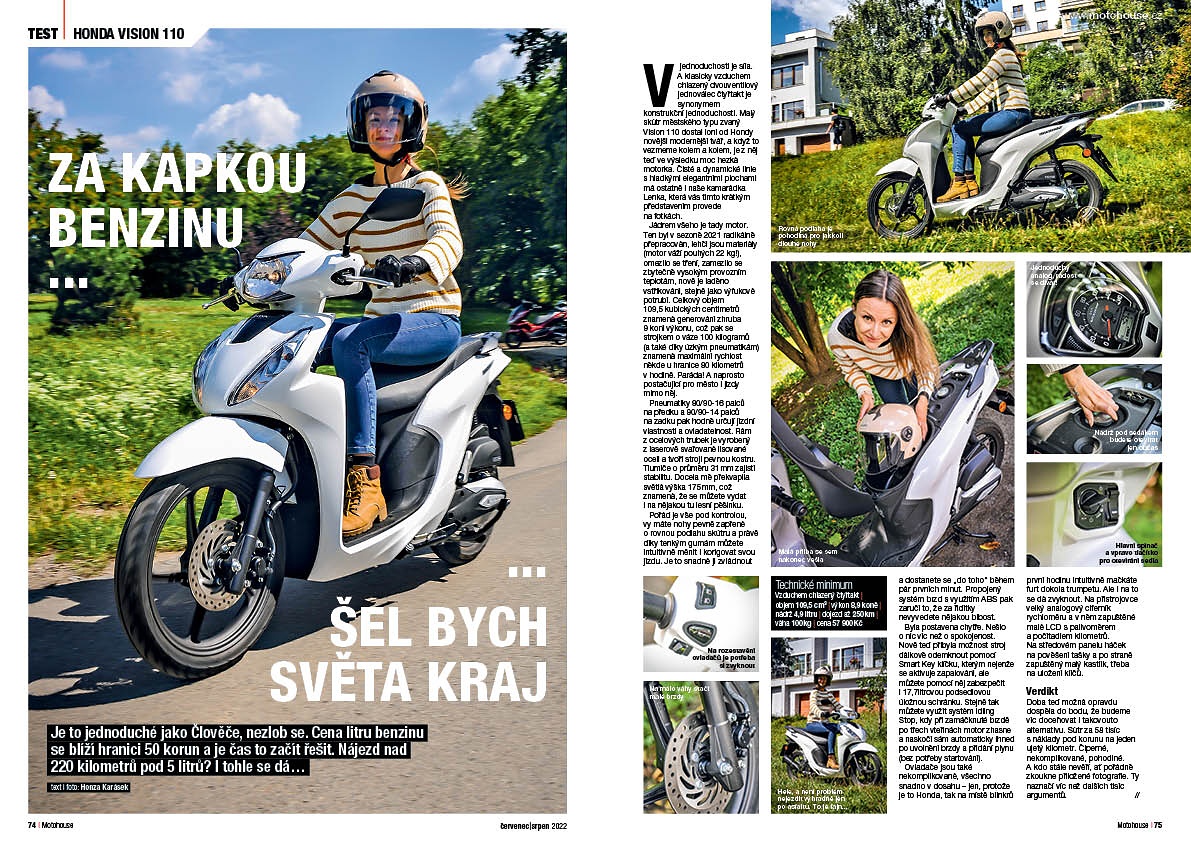 V jednoduchosti je síla. A klasicky vzduchem chlazený dvouventilový jednoválec čtyřtakt je synonymem konstrukční jednoduchosti. Malý skútr městského typu zvaný Vision 110 dostal loni od Hondy novější modernější tvář, a když to vezmeme kolem a kolem, je z něj teď ve výsledku moc hezká motorka. Čisté a dynamické linie s hladkými elegantními plochami má ostatně i naše kamarádka Lenka, která vás tímto krátkým představením provede na fotkách.